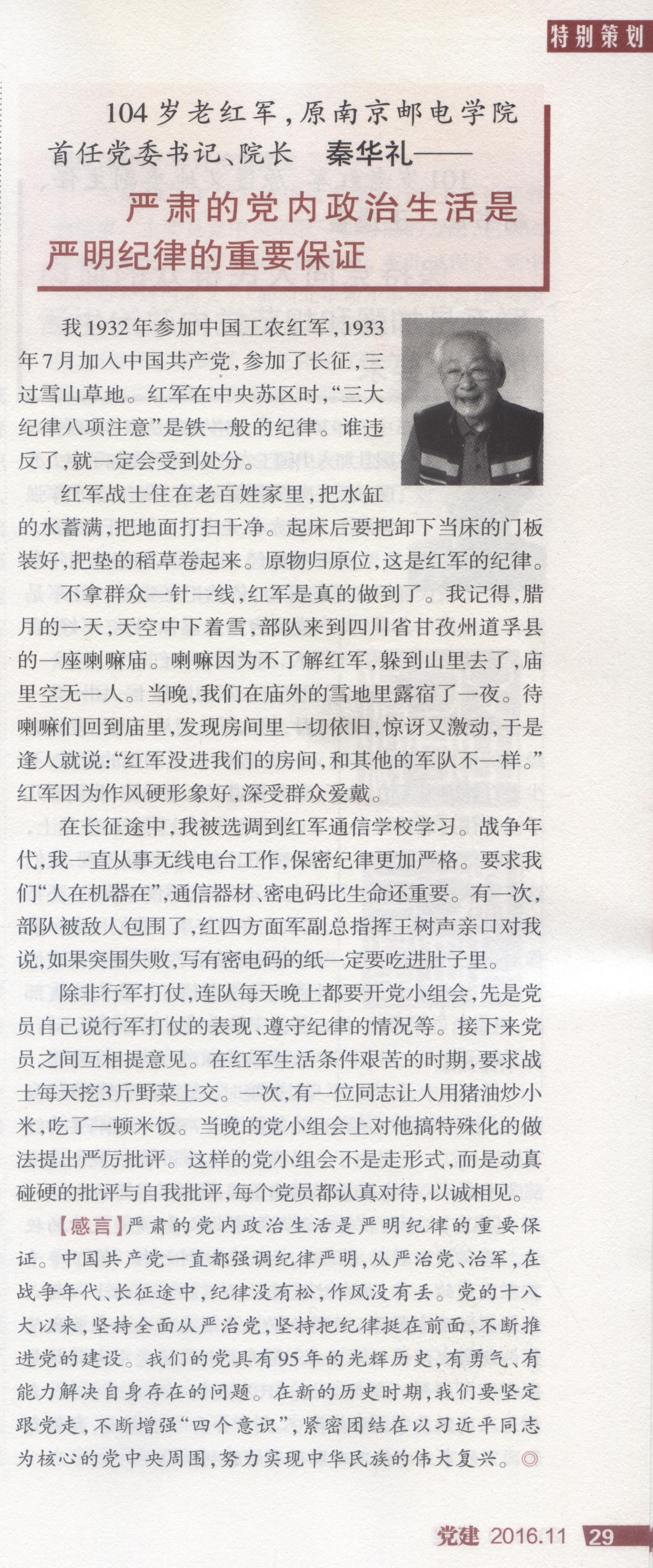 ——2016年第10期《黨建》雜志:革命人永遠是年輕—記104歲的老紅軍、原南京郵電學院首任黨委書記兼院長秦華禮