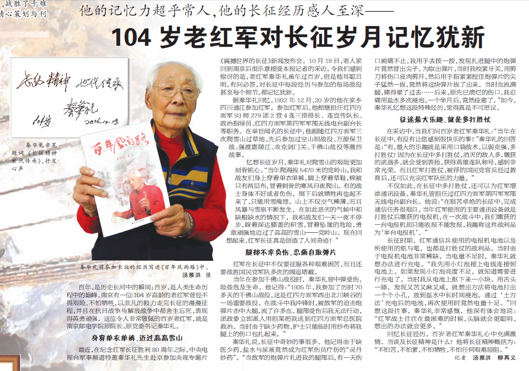 ——2016年8月30日 《南京日報》 103歲老紅軍秦華禮憶長征:理想、信念、意志支撐我們走下去