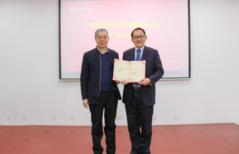 12月10日下午,歐洲科學(xué)院院士李全教授受聘南京郵電大學(xué)名譽教授儀式在仙林校區(qū)電光學(xué)科樓舉行,我校副校長汪聯(lián)輝教授為李全院士頒發(fā)聘書、佩戴?;铡V袊锢韺W(xué)會液晶專業(yè)委員會主任、南京大學(xué)副校長陸延青教授,東南大學(xué)化工學(xué)院副院長楊洪教授出席授聘儀式。