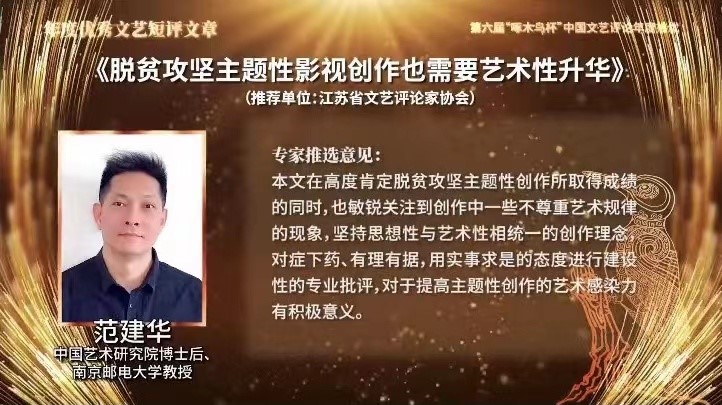 1月13日,第六屆“啄木鳥杯”中國文藝評論年度推優發布典禮在北京舉行。我校傳媒與藝術學院教授范建華的論文《脫貧攻堅主題性影視創作也要藝術性升華》獲評優秀文藝評論作品。該作品在1月14日中央電視臺新聞頻道《朝聞天下》報道中被重點提及。