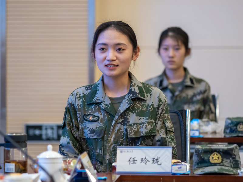 座談會上,隊員們回味著加入國護隊的初衷,感慨著在隊中成長的點滴,分享著出任務時的動人故事。他們中,有毅然加入國護隊、為隊伍添磚加瓦的退役大學生士兵,有歷經層層選拔、受過嚴格訓練的老隊員,也有用自己赤忱熱情、勤奮又井井有條的新隊員。對國旗的守護、對軍人的崇敬、對軍裝的向往將來自五湖四海的隊員們凝聚在一起,“沐朝露,伴夕陽”的升降旗儀式、“千錘萬擊”的隊列訓練培養了他們的集體榮譽感,“無懼風雨,并肩前行”的信念支撐著他們為南郵這個“家”撐起了一片天。每位隊員講話結束,在座師生們都致以真摯且熱烈的掌聲,隊歌《祖國不會忘記》的歌聲回蕩在會場,堅定亦激昂。