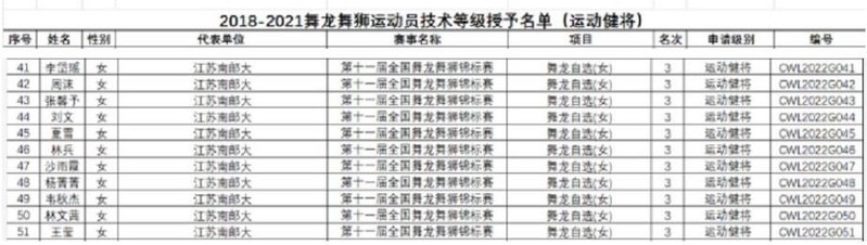 4月2日,中國龍獅運動協會發布2018-2021年舞龍舞獅運動員技術等級授予名單,我校大學生龍獅團周沫同學等11名隊員被授予“運動健將”稱號,這是我校學生首次獲得這一榮譽等級稱號。