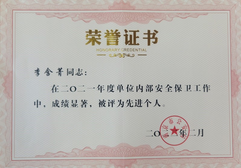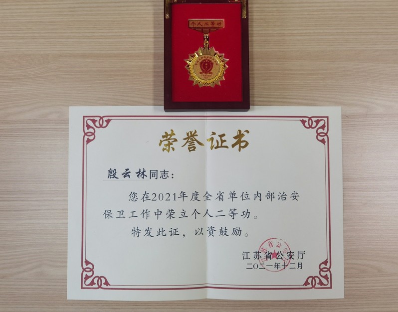 近日,江蘇省公安廳和南京市公安局對在2021年度單位內部治安保衛工作中做出顯著成績的保衛組織和人員進行表彰,江蘇省公安廳給予我校殷云林同志記個人二等功一次。南京市公安局給予謝秉宸同志記個人三等功一次,評選陳韶成和李含菁同志為先進個人。