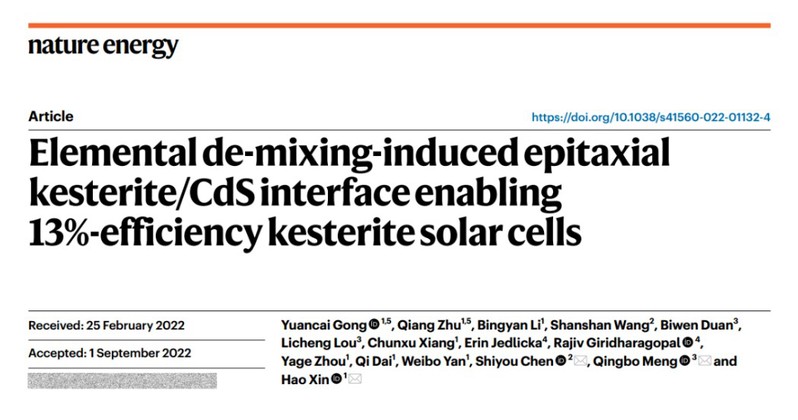 Nature Energy 刊發辛顥教授團隊在銅鋅錫硫薄膜太陽能電池領域研究進展
