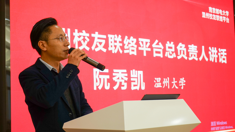 阮秀凱代表溫州校友聯絡平臺,對母校領導和各位校友表示熱烈歡迎和衷心感謝,并深情回顧了在南郵求學、生活的美好記憶。他表示,溫州校友聯絡平臺是校友與母校之間信息交流、感情聯絡、資源共享的重要紐帶,是南郵人共同的精神家園,將秉承著“敘情誼、聚共識、謀發展”的理念,凝心聚力、群策群力,為學校發展匯聚新才智、注入新動能,推動形成優勢互補、共創共贏的典型示范。