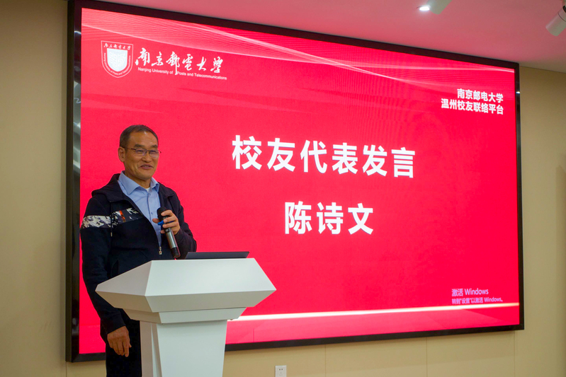 溫州聯通原副總經理陳詩文校友作為溫州校友代表發言。他表示,母校的發展和校友的發展榮辱與共,振興南郵與每一個南郵校友息息相關,溫州校友要與母校一起凝心聚力,講好校友故事,發揮校友智慧,匯集校友力量,為母校向電子信息領域特色鮮明的高水平大學奮進作出應有的貢獻。