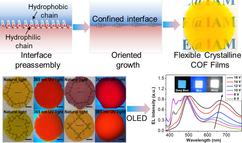 基于此,本研究首次構建了COF基柔性有機發光二極管(OLED)原型器件,其光電轉換效率達到同類器件最高水平,且發光顏色可通過電壓調控實現從深藍到白光的連續變化,這為智能動態顯示提供了新方案。研究還通過時間分辨SEM、XRD和FTIR追蹤了界面預組裝定向生長策略下COF薄膜的界面預組裝、定向生長與結晶化過程,為理解材料生長動力學提供了實驗依據。