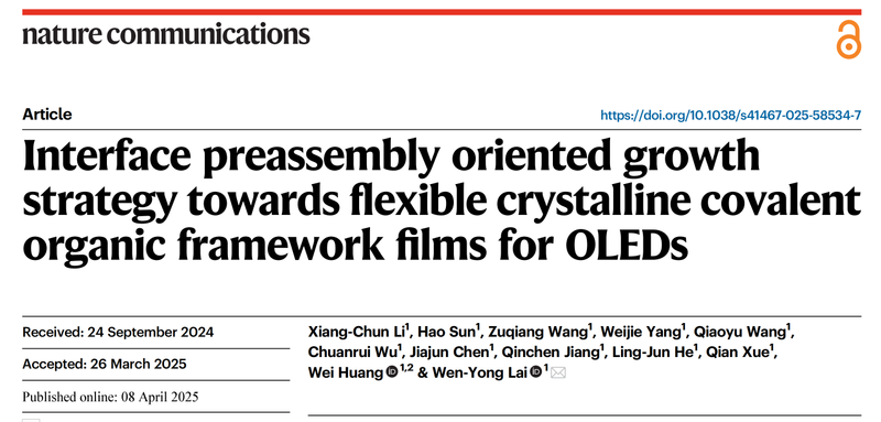 南京郵電大學柔性電子全國重點實驗室/化學與生命科學學院賴文勇教授課題組在柔性晶態光電薄膜材料設計制備與功能調控方向取得重要進展,其提出的界面預組裝定向生長(IPOG)策略為平衡材料結晶性與柔韌性這一長期科學難題提供了新思路。研究聚焦于共軛有機框架(COF)材料的結構-性能關系,通過分子設計實現了材料光電特性與力學性能的協同調控。相關成果以“Interface Preassembly Oriented Growth Strategy Towards Flexible Crystalline Covalent Organic Framework Films for OLEDs”為題發表于《自然·通訊》(Nature Communications, 2025, 16, 3321)。