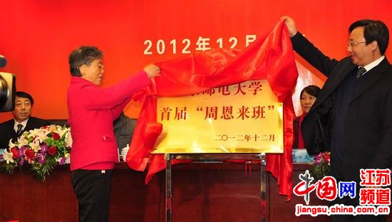 據介紹,“周恩來班、鄧穎超班”的創建活動始于1986年孫逸江老師在南京梅園中學開展的學習周恩來“‘為中華之崛起’而勤奮讀書”的活動。從1997年以來,“周恩來班、鄧穎超班”的創建活動有了較大的發展。目前江蘇省大、中、小學中建有近百個“周恩來班”、“鄧穎超班”,江蘇高校中有6個“周恩來班”。南京郵電大學的人文與社會科學學院2011級公共事業管理班目前被命名為“周恩來班”。
