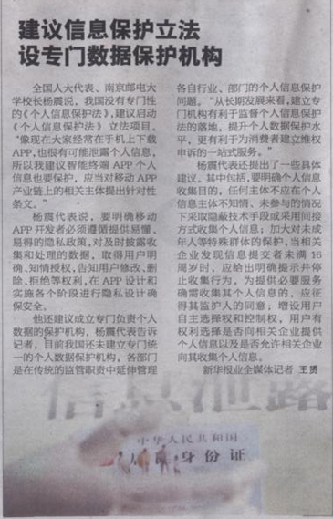 【揚子晚報】建議信息保護立法 設專門數據保護機構