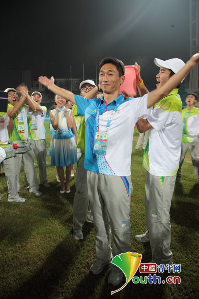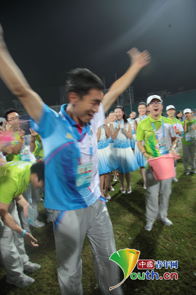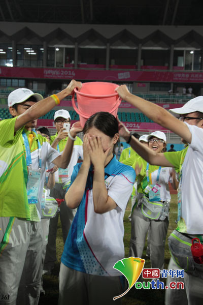 中國青年網南京8月27日電 昨日,南京郵電大學的“小青檸”圓滿完成南京青奧會期間的志愿者任務,在告別儀式上,快樂的小青檸們多次上演冰桶挑戰。