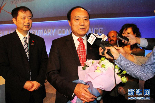 10月23日,在韓國釜山召開的國際電信聯盟2014年全權代表大會上,趙厚麟(中)接受采訪