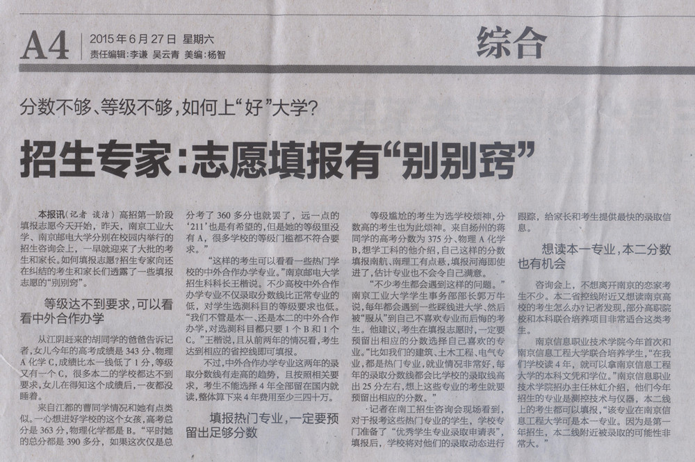 【南京日報】招生專家:志愿填報有“別別竅”