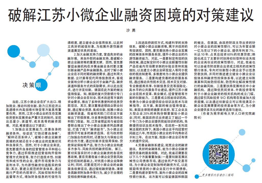 【新華日報】破解江蘇小微企業融資困境的對策建議