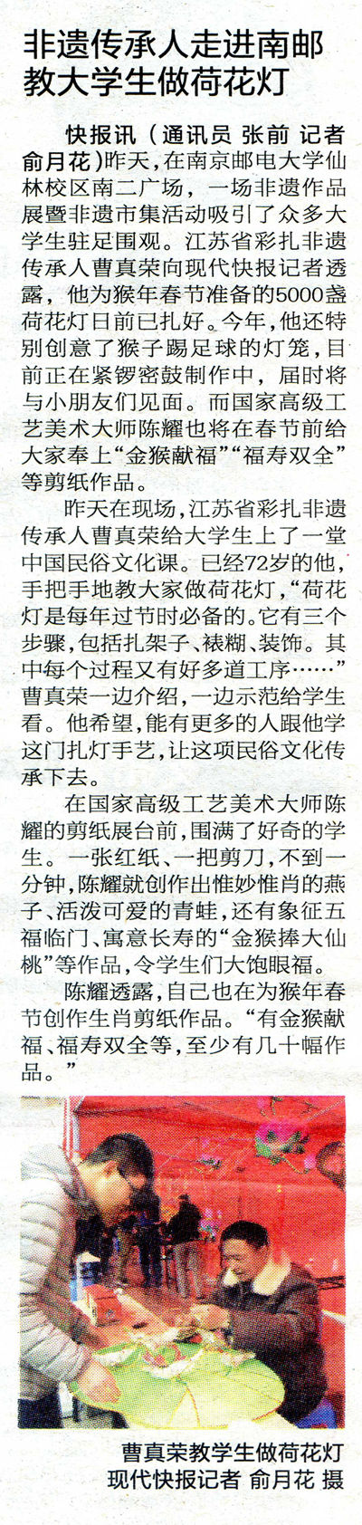 【現代快報】非遺傳承人走進南郵教大學生做荷花燈