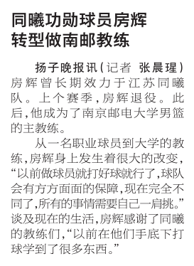 【揚子晚報】同曦功勛球員房輝轉型做南郵教練