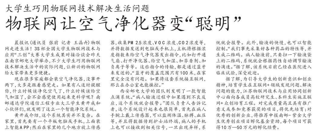【南京晨報】物聯網讓空氣凈化器變“聰明”