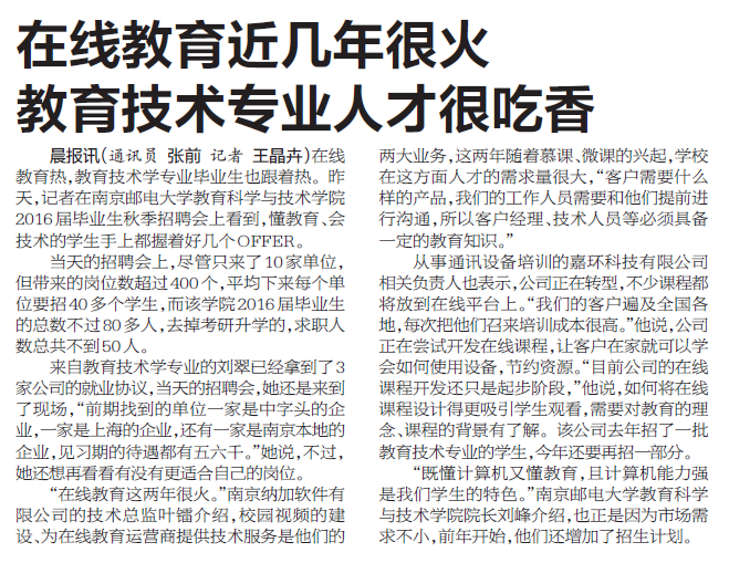 【南京晨報】在線教育近幾年很火 教育技術專業人才很吃香