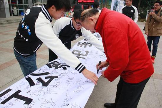 活動(dòng)現(xiàn)場(chǎng)由“和平之花”——佩戴紫金草徽章行動(dòng)、“墨哀英魂”——主題書(shū)法展、“眾指成城”——指印寄思等別出心裁、內(nèi)涵豐富、寓意深刻的系列活動(dòng)組成。上午十時(shí)零一分,隨著防空警報(bào)聲在南京上空響起,在場(chǎng)同學(xué)佩帶著由南京廣播電視臺(tái)發(fā)放的象征和平的紫金草徽章集體默哀。隨后,活動(dòng)有序開(kāi)展,同學(xué)們依次參觀了書(shū)法作品展,在中國(guó)地圖上按下紅色指印,并在 “國(guó)行公祭,祀我國(guó)殤。永矢弗諼,祈愿和平”的標(biāo)語(yǔ)上簽名,表明了同學(xué)們齊心協(xié)力,攜手共進(jìn),誓親手捍衛(wèi)祖國(guó)領(lǐng)土完整的決心。本次系列活動(dòng)由12月9日的“金陵名人堂”報(bào)告會(huì)拉開(kāi)序幕,報(bào)告會(huì)邀請(qǐng)了侵華日軍南京大屠殺遇難同胞紀(jì)念館副館長(zhǎng)陳俊峰先生進(jìn)行有關(guān)日軍侵華史的演講,激發(fā)了南郵學(xué)子的愛(ài)國(guó)熱情。