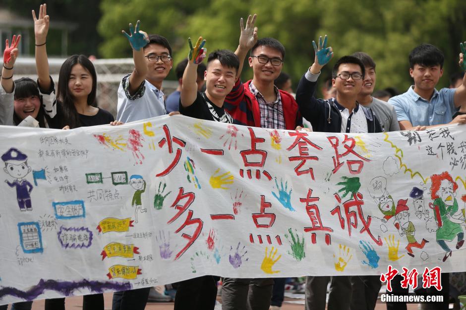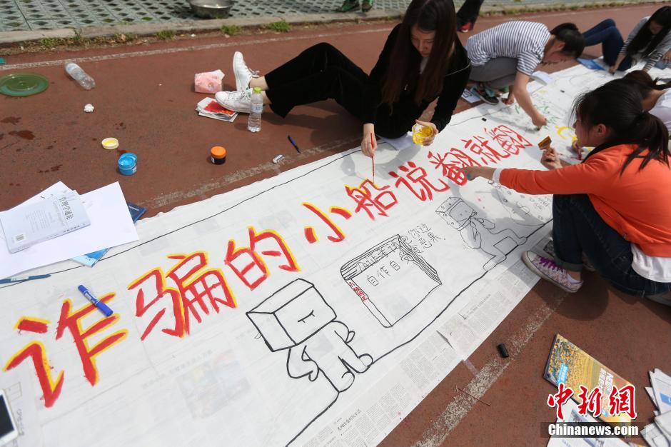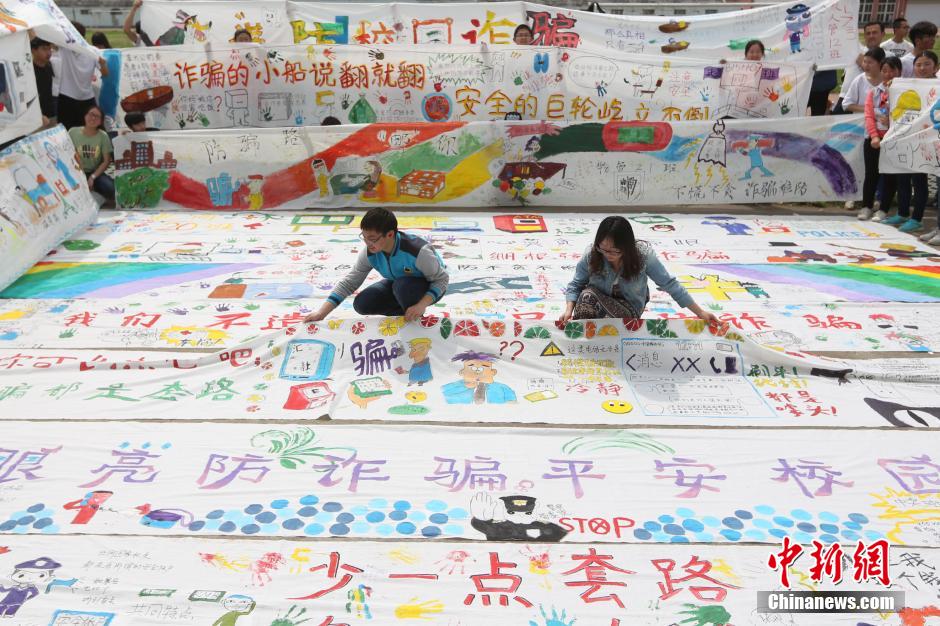 4月22日,以“防詐騙”為主題的手繪公開課在南京郵電大學三牌樓校區操場上舉行,來自管理學院的600名大一學生一起拿起畫筆,在畫布上繪制“詐騙的小船說來就來”、“親,你可長點心吧!”、“千里之外不見面,提防網絡把你騙”、“招聘廣告莫輕信,天上不會掉餡餅”等朗朗上口、過目不易忘的語句,同時配上五彩顏色的漫畫,用寓教于樂的方式增強大學生們的安全意識。中新社記者 泱波 攝
