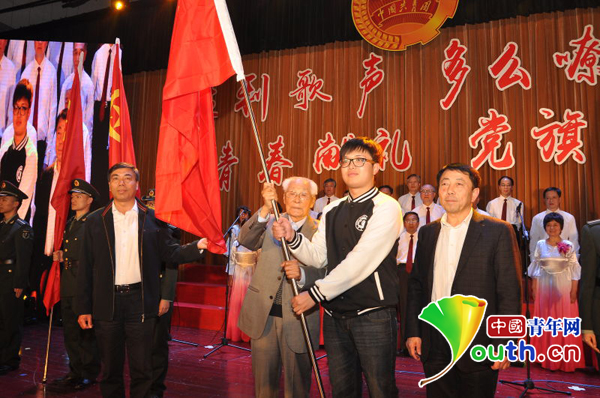 秦華禮向青年學生代表、南郵學生會主席張云飛授予共青團團旗。南京郵電大學 供圖