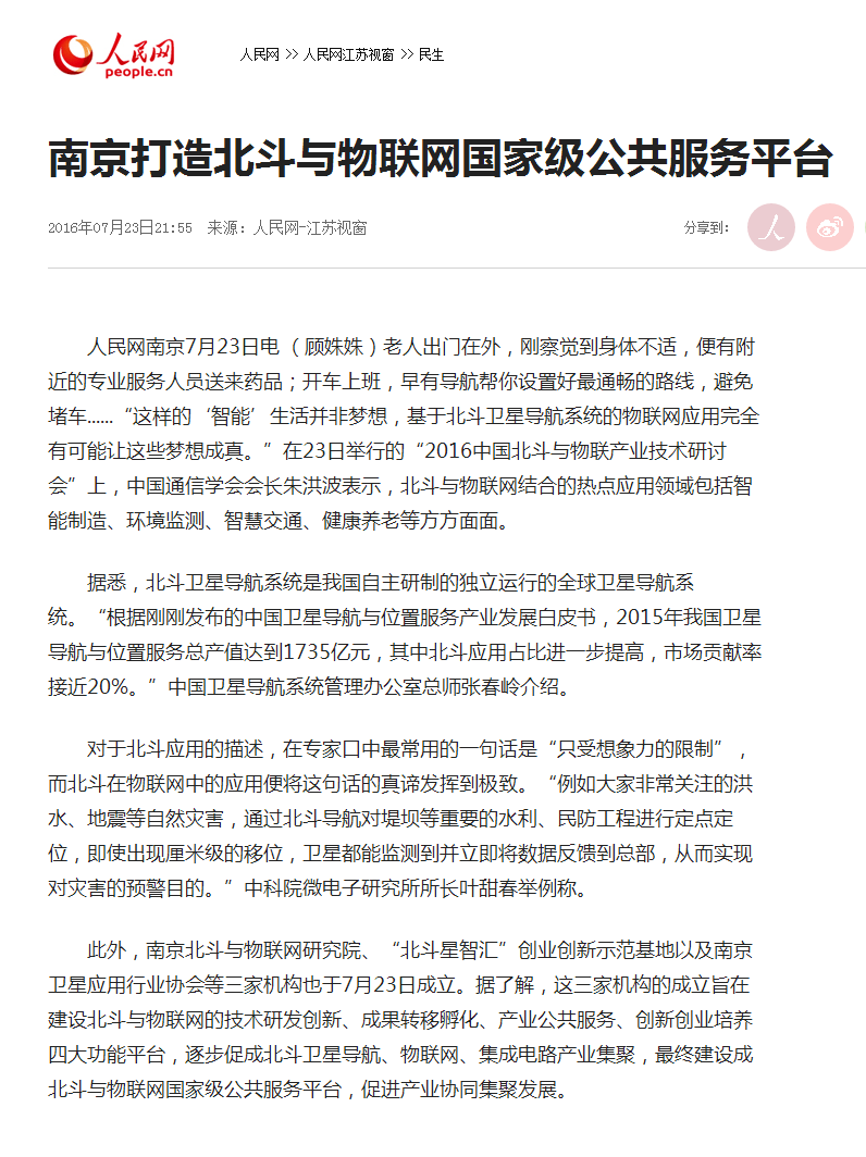 【人民網江蘇視窗】南京打造北斗與物聯網國家級公共服務平臺