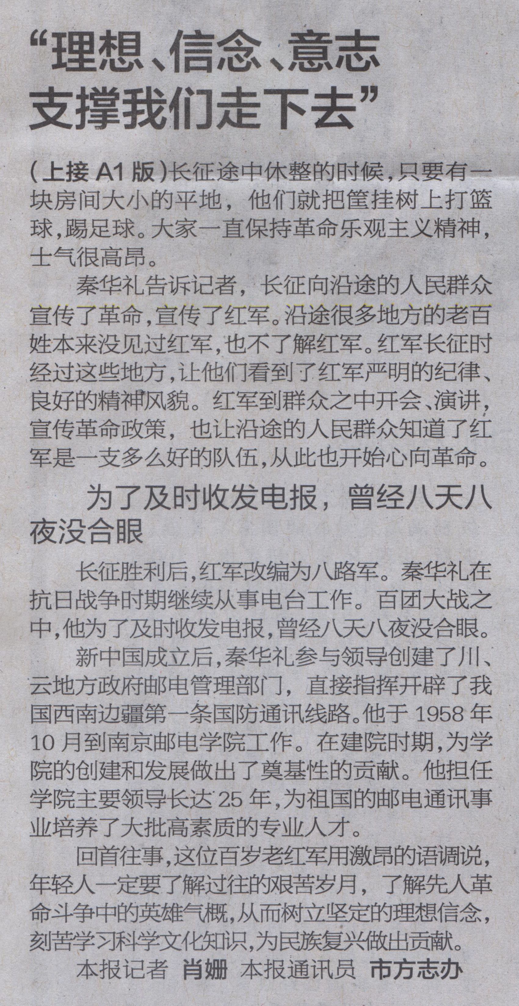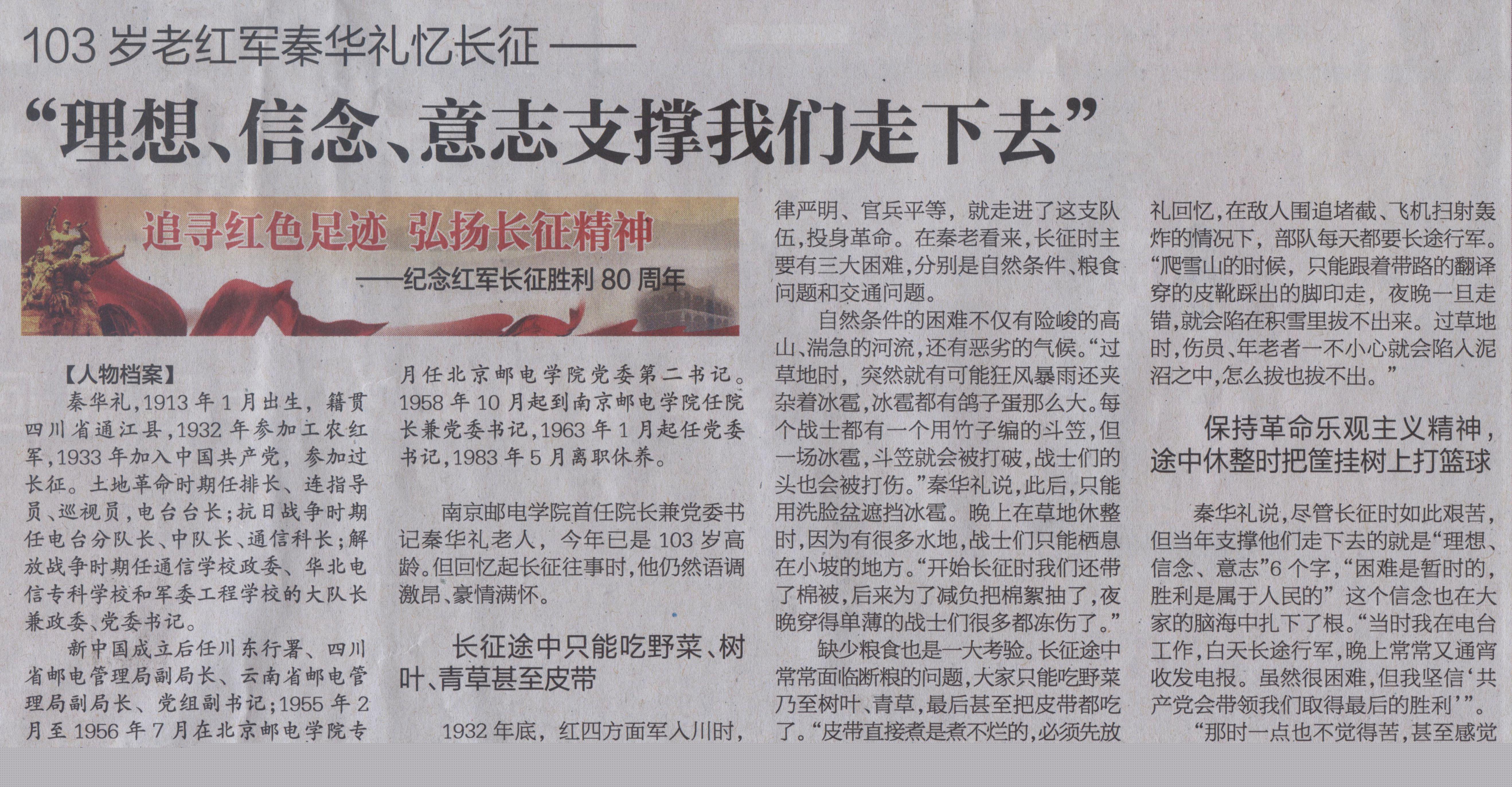 【南京日報】103歲老紅軍秦華禮憶長征——“理想、信念、意志支撐我們走下去”