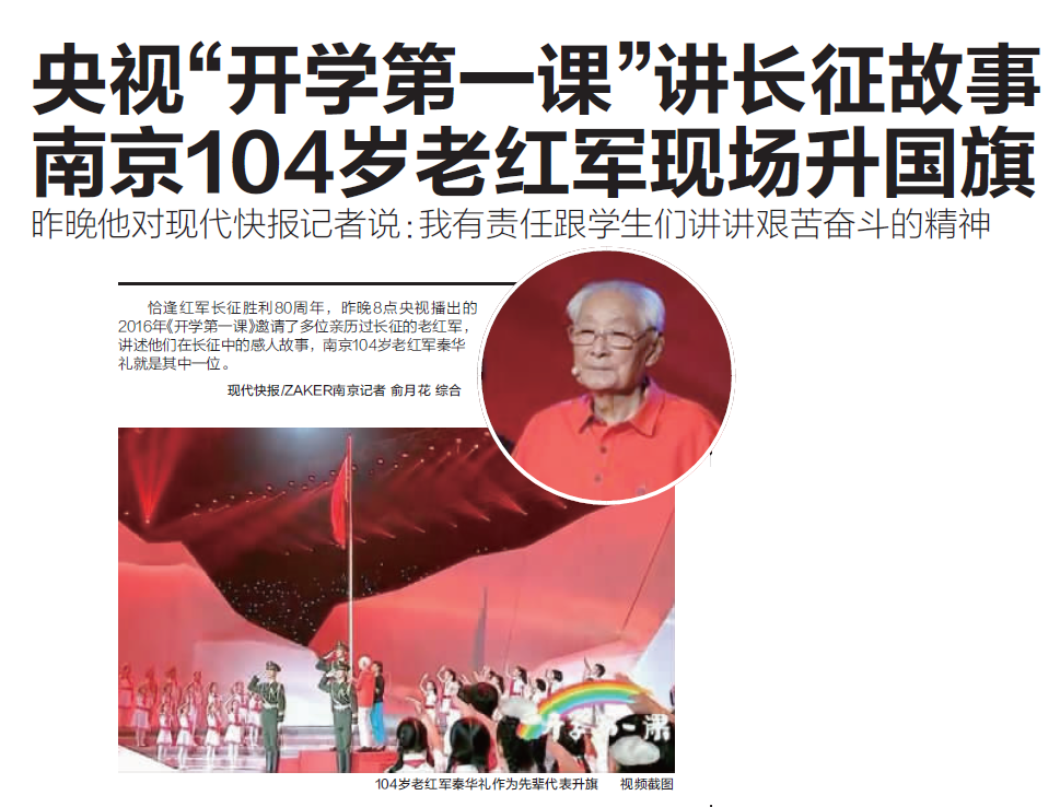 【現(xiàn)代快報(bào)】央視“開(kāi)學(xué)第一課”講長(zhǎng)征故事 南京104歲老紅軍現(xiàn)場(chǎng)升國(guó)旗