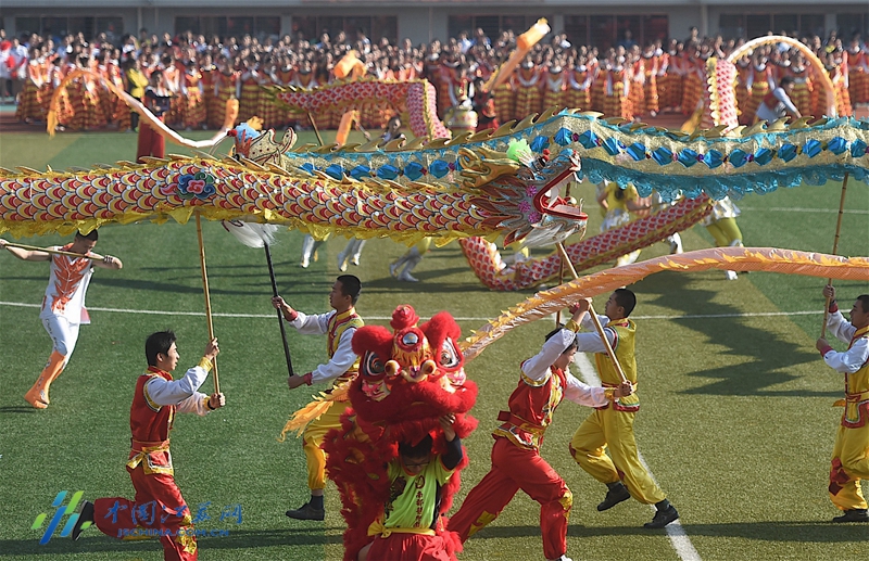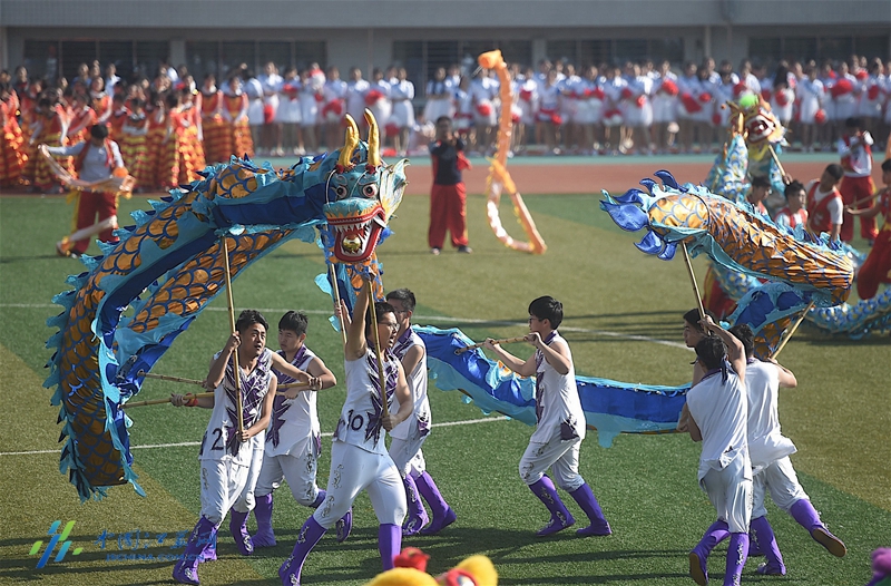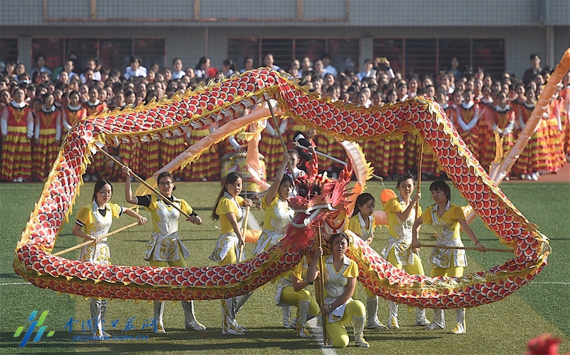 中國江蘇網11月4日訊(新華報業全媒體記者 邵丹 羅鵬)今天上午,南京郵電大學舉辦校園田徑運動會。往日紅色的田徑跑道瞬間變成上萬名師生“紅毯”秀場。大家穿著盛裝,展示各個學院的風采,特別是經濟學院穿著“龍袍”的近200名學生們集體舞龍,氣勢恢宏。其中有七八條大龍,每條龍里有9名學生組成。孔雀開屏、龍出宮、大橫八字……龍獅隊個個精神抖擻,能擺出很多高難度動作,,受到學生熱捧。據悉,南郵龍獅隊創建于2009年,在南京高校中是出了名的。曾多次參加國家級和省內龍獅精英賽,連續多次捧回冠軍。