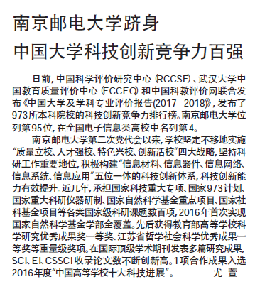 【新華日報】南京郵電大學躋身中國大學科技創新競爭力百強