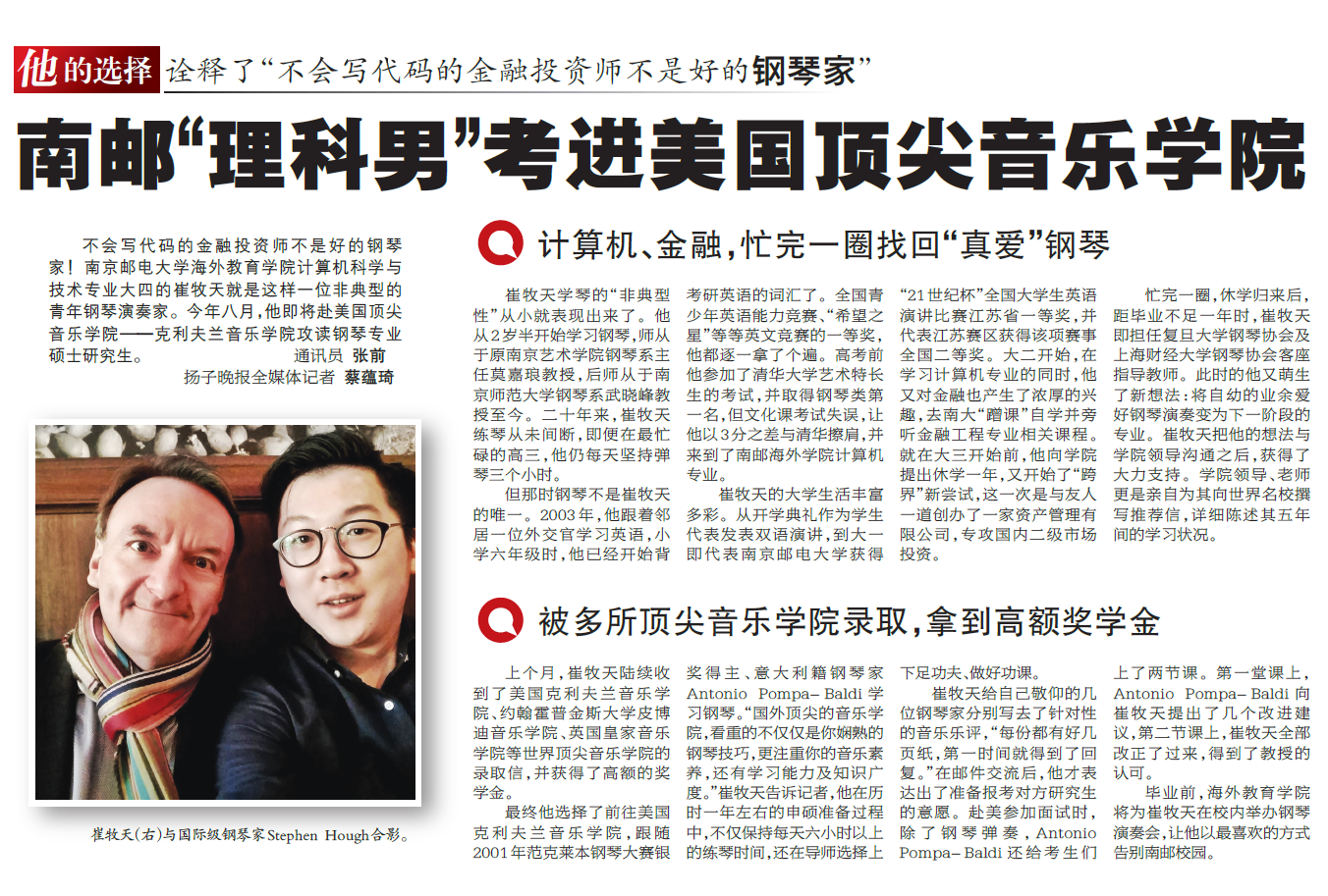 【揚子晚報】南郵“理科男”考進美國頂尖音樂學院