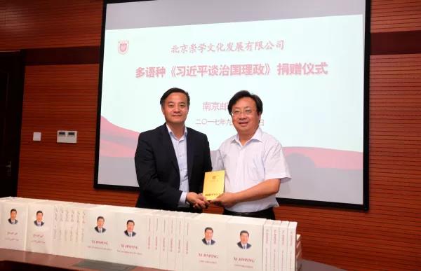 儀式上,余富文總經理代表北京崇學文化發展有限公司向南郵贈書,圖書館、外國語學院、海外教育學院負責人接受了贈書。《習近平談治國理政》收入了習近平總書記在2012年11月15日至2014年6月13日這段時間內的講話、談話、演講、答問、批示、賀信等79篇,分為18個專題。該書全面系統回答了新的時代條件下中國發展的重大理論和現實問題,是國際社會了解當代中國的重要窗口、尋找中國問題答案的一把鑰匙。