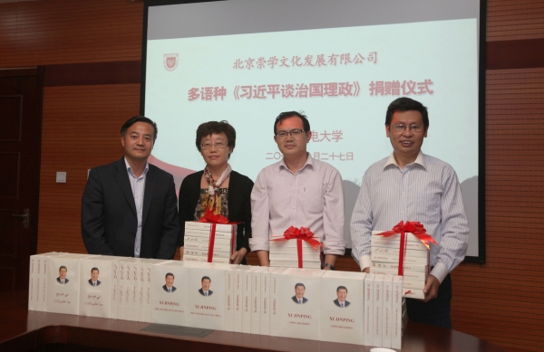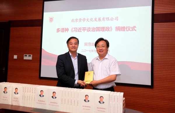 9月27日,北京崇學文化發展有限公司向南京郵電大學捐贈多語種《習近平談治國理政》儀式在仙林校區舉行。北京崇學文化發展有限公司總經理余富文,南京郵電大學黨委書記劉陳,校黨委常委、副校長李子全出席儀式。