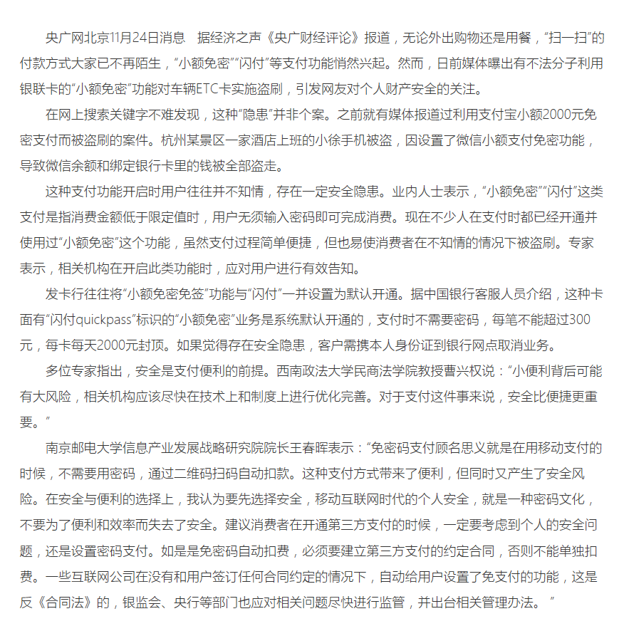【央廣網】“小額免密” 謹防小便利背后的大風險