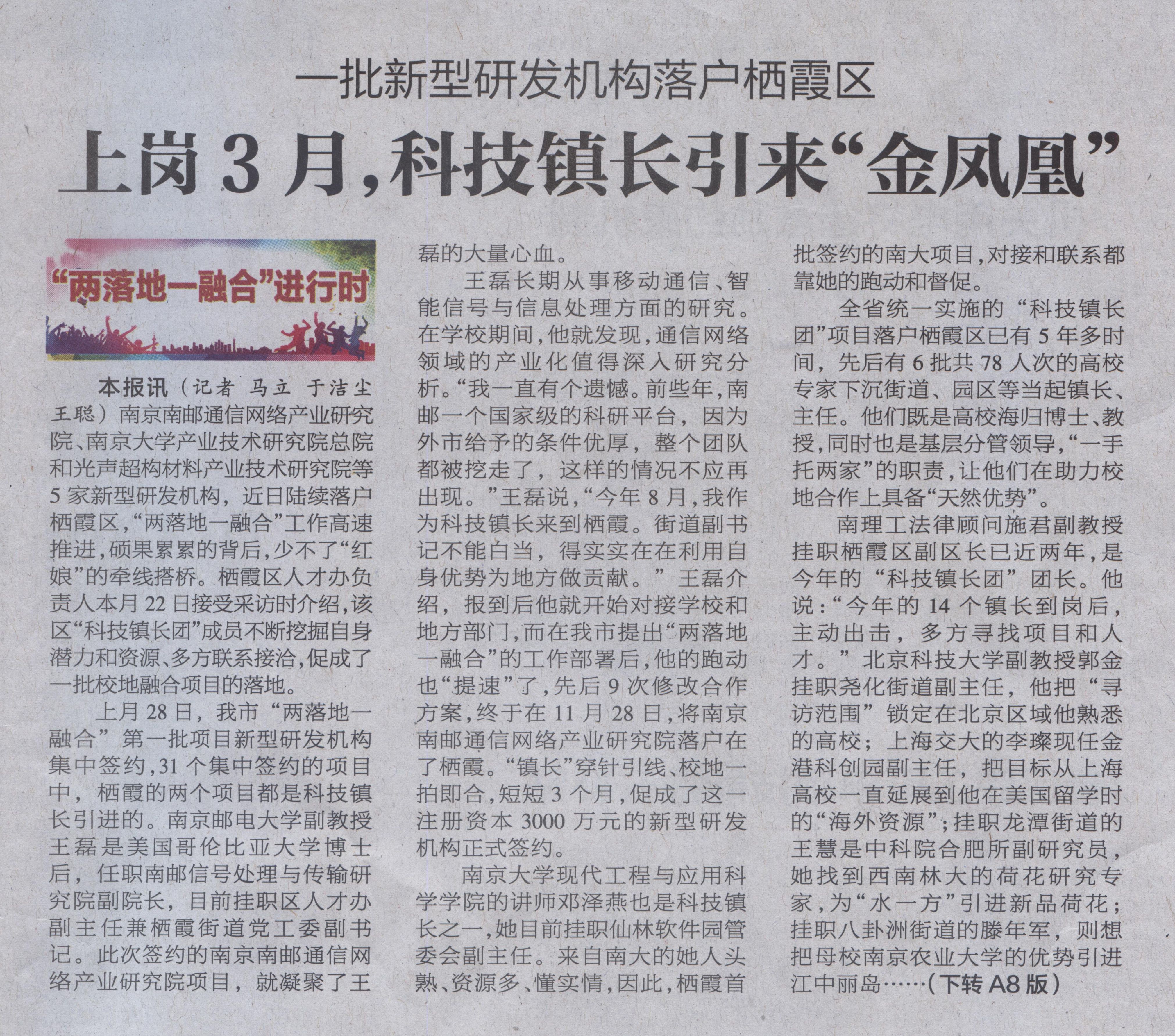 【南京日報】上崗3月,科技鎮長引來“金鳳凰”