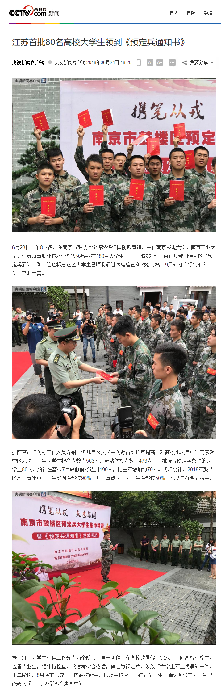 【央視網(wǎng)】江蘇首批80名高校大學(xué)生領(lǐng)到《預(yù)定兵通知書》