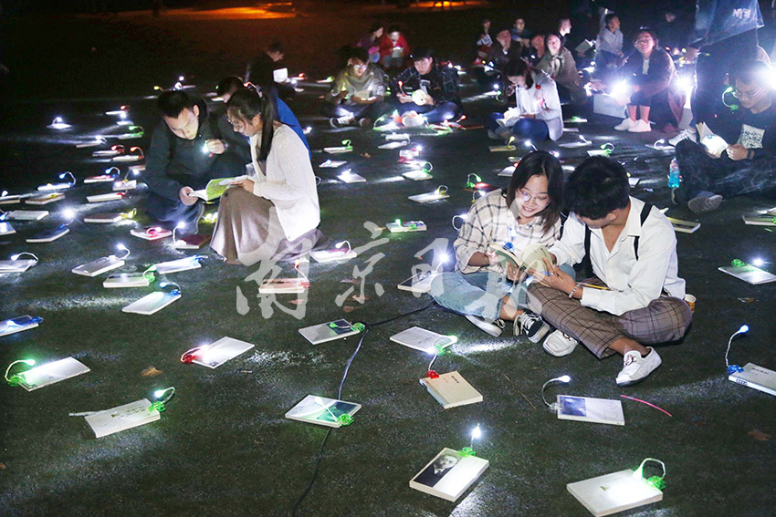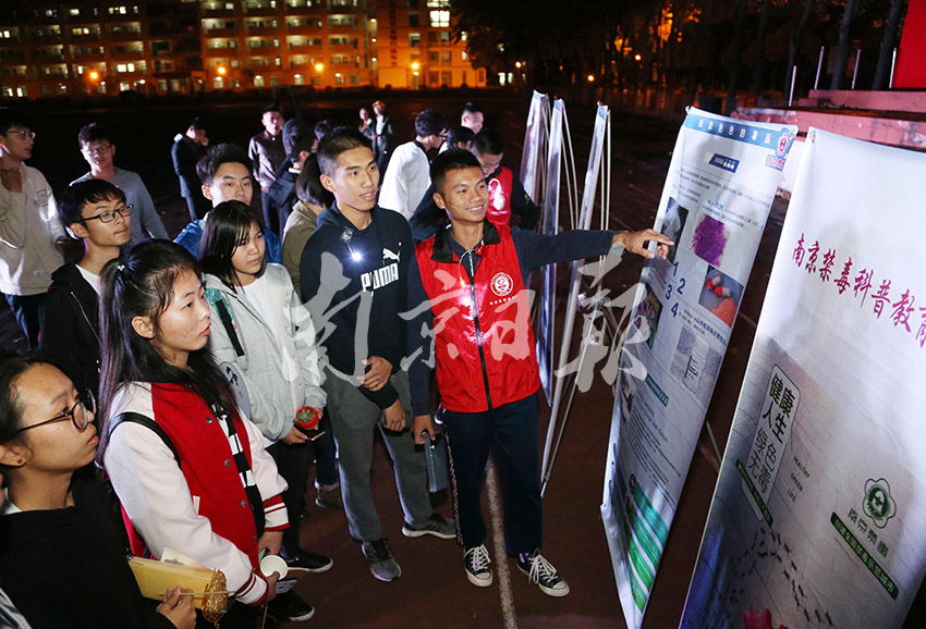2018年10月28日晚,南京市禁毒辦,玄武區禁毒辦聯合合作單位,在南郵操場舉行一場“書約青春”禁毒教育活動,共有近千名各大院校大學生前來參加。南郵草坪上,擺放著近2000本包括文學、心理、禁毒等各類書籍,每本書上夾著小書燈,供大學生們閱讀。活動中,南京禁毒高校聯盟志愿者在展板前宣講禁毒知識,禁毒民警向大學生們推薦“南京禁毒”公眾號,展示禁毒書籍,現場回答大家提問,邀請大學生參加南京市禁毒高校聯盟,共同成為禁毒衛士。南報網記者 吳彬攝
