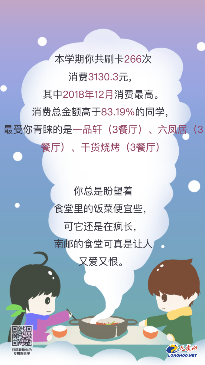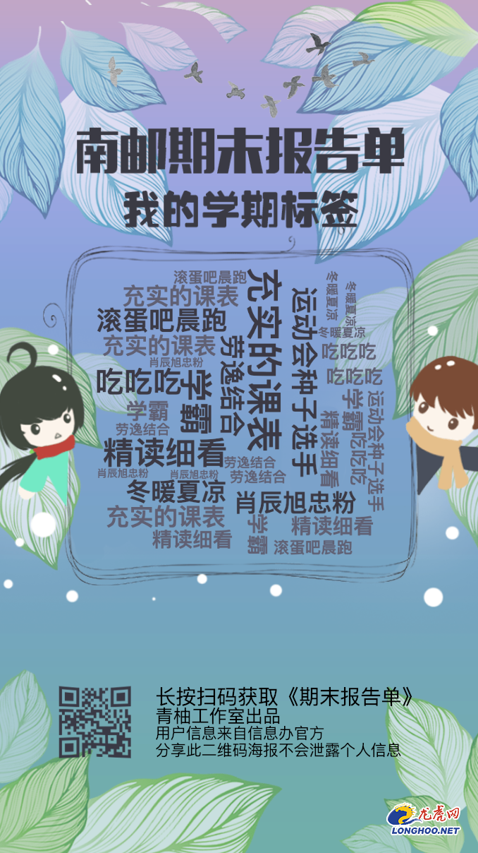 龍虎網訊 上課節數時長、圖書館借閱、食堂消費偏愛餐廳、寢室用電、專屬學期標簽……近日,南京郵電大學2019冬季版期末報告單新鮮出爐,用大數據回顧一學期的點點滴滴,網友評價:都是別人家的學校。