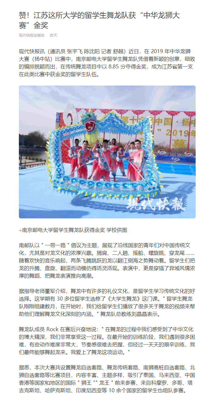 【現代快報全媒體】贊!江蘇這所大學的留學生舞龍隊獲“中華龍獅大賽”金獎
