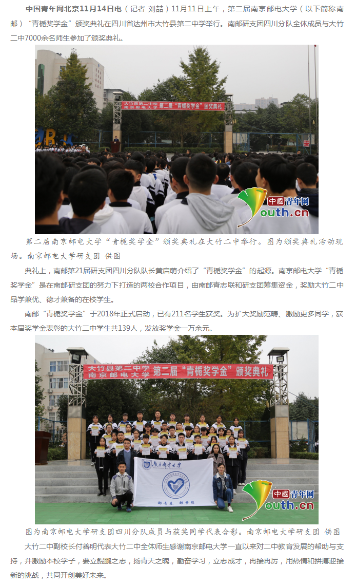 【中國青年網】南郵“青梔獎學金”頒獎典禮在大竹二中舉行