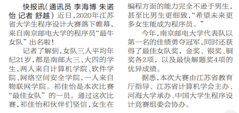 【現代快報】江蘇大學生程序設計大賽“最佳女隊”來自南郵