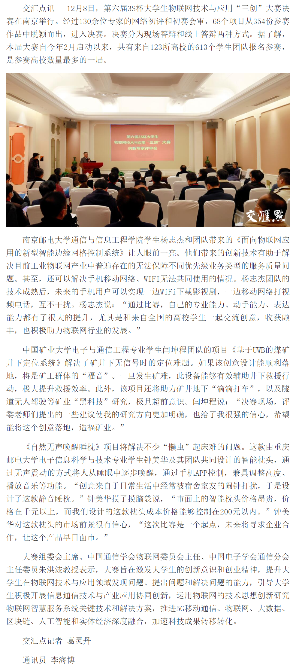 【新華日報客戶端】3S杯大學生物聯網技術與應用“三創”大賽決賽在南京舉行