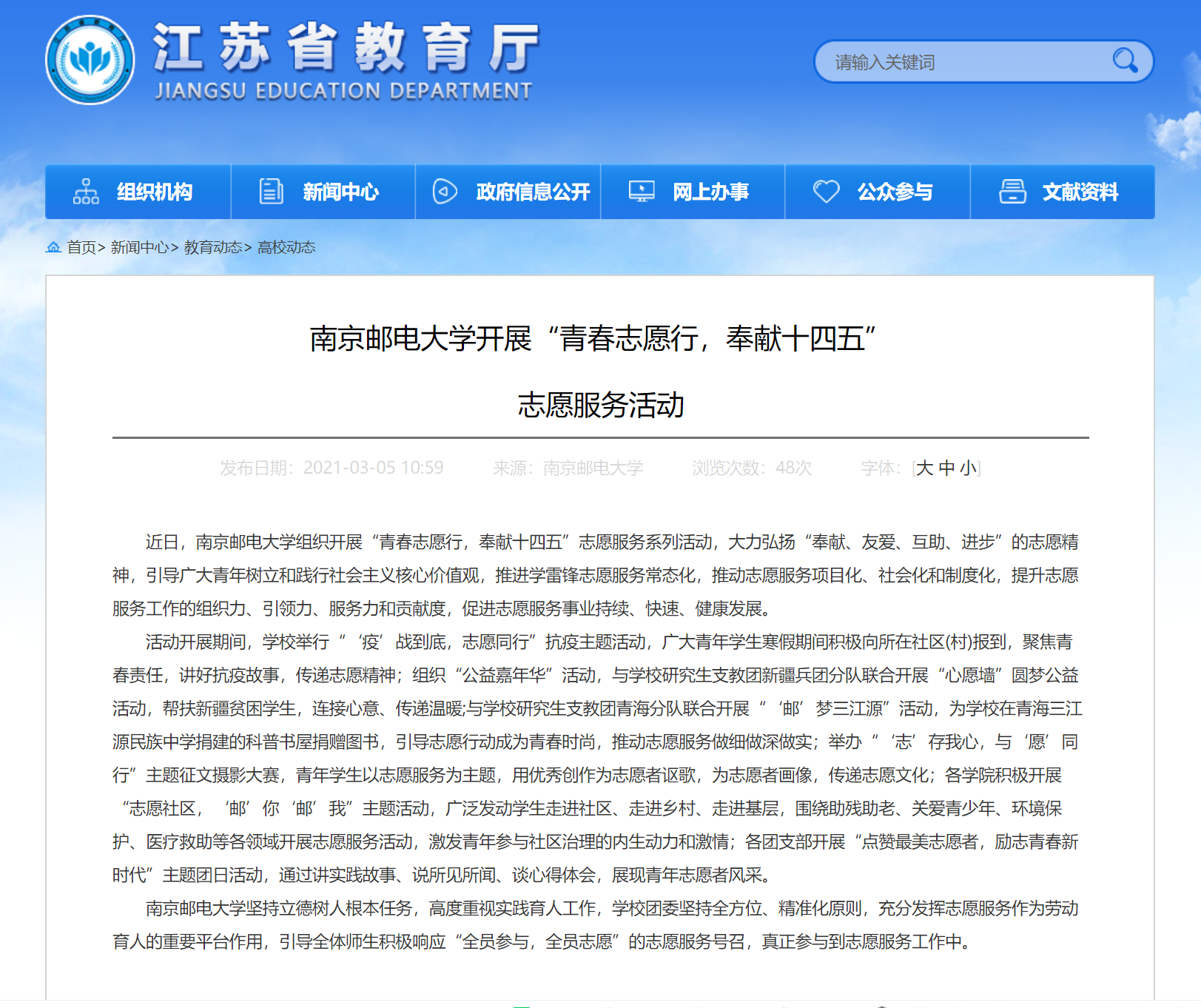 【省教育廳官網】南京郵電大學開展“青春志愿行,奉獻十四五”志愿服務活動