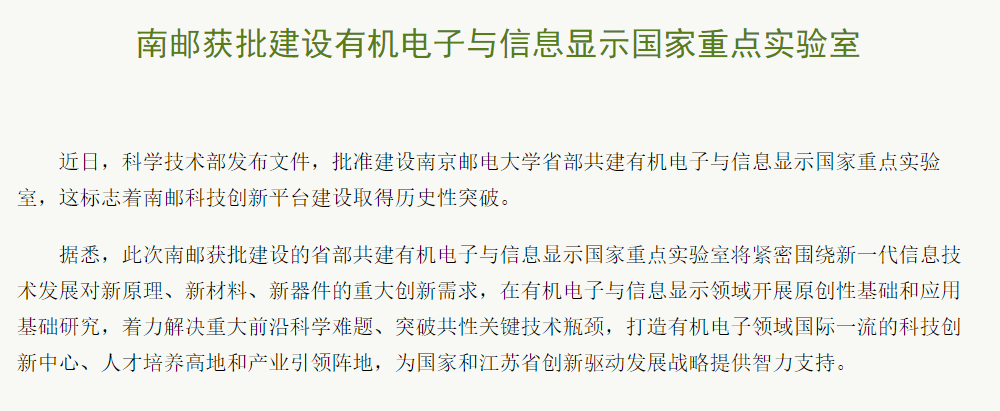【中國(guó)科學(xué)網(wǎng)】南郵獲批建設(shè)有機(jī)電子與信息顯示國(guó)家重點(diǎn)實(shí)驗(yàn)室