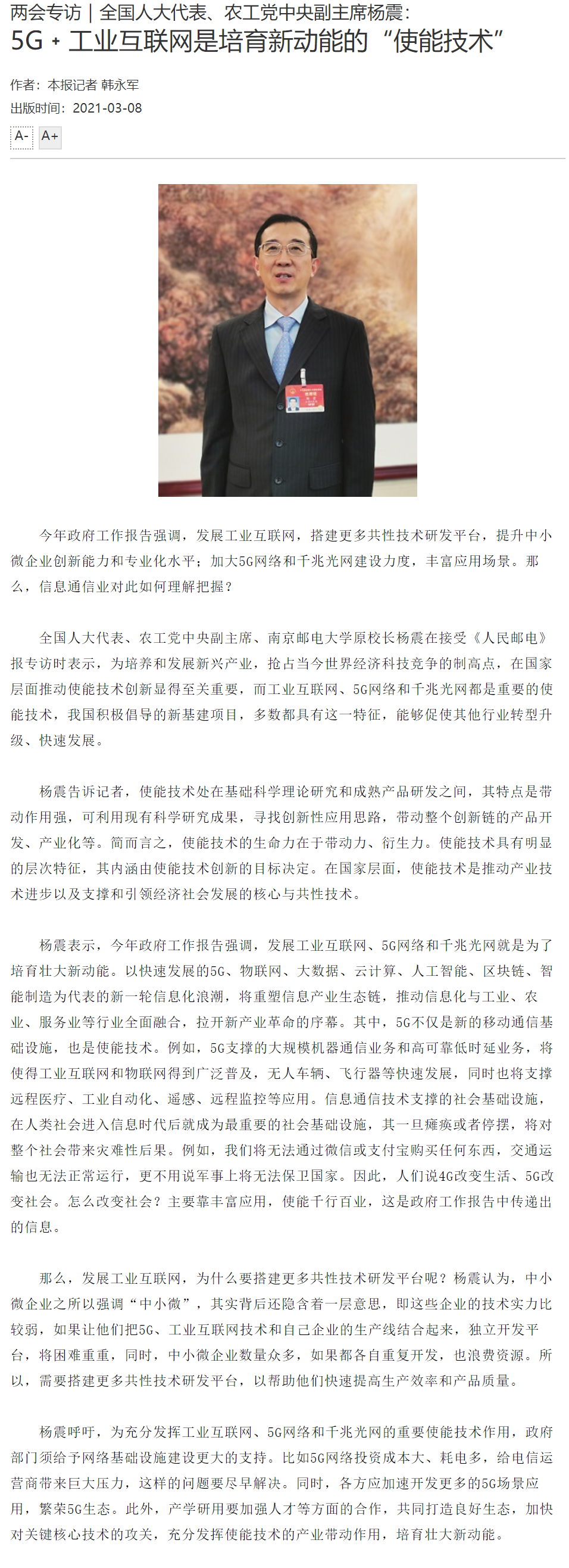【人民郵電報】全國人大代表、農工黨中央副主席楊震:5G﹢工業互聯網是培育新動能的“使能技術”