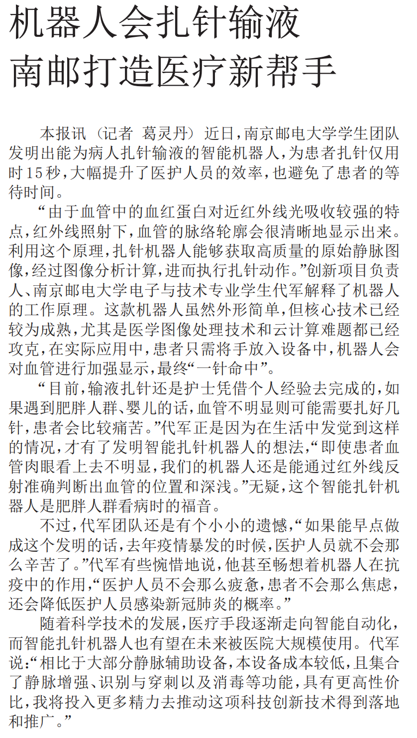 《新華日報》機器人會扎針輸液 南郵打造醫療新幫手
