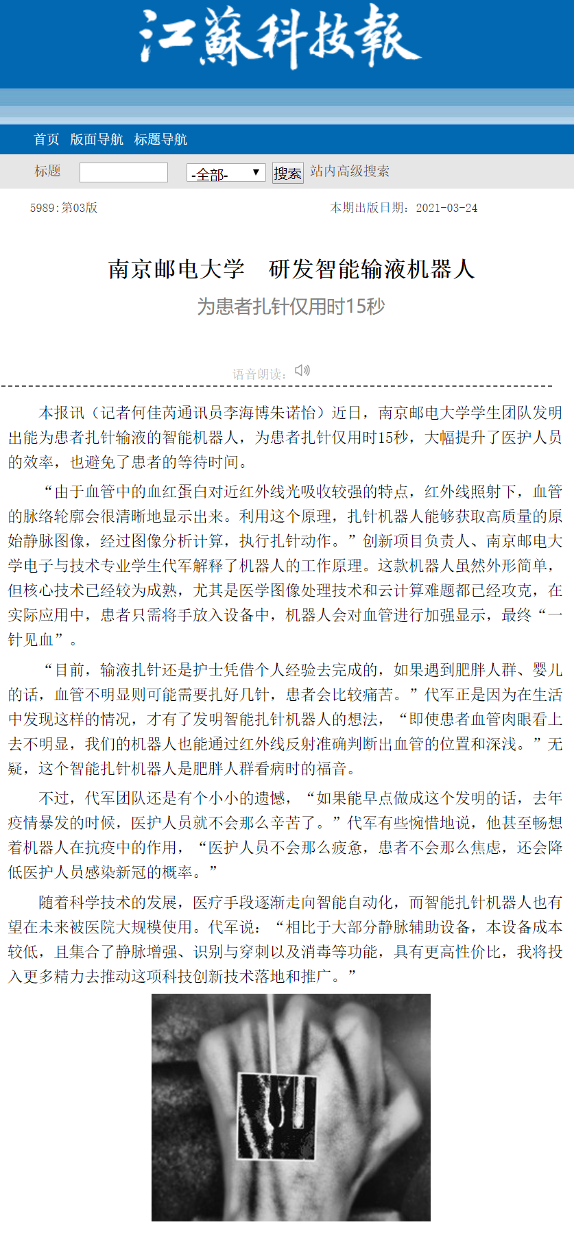 《江蘇科技報》南京郵電大學 研發智能輸液機器人