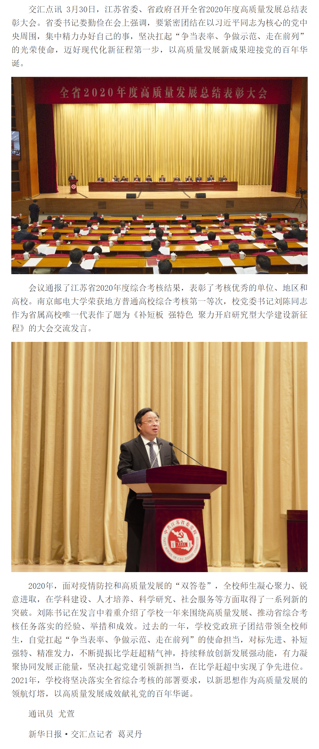 【新華日報客戶端】南京郵電大學榮獲江蘇省2020年度綜合考核第一等次 校黨委書記作大會交流發言