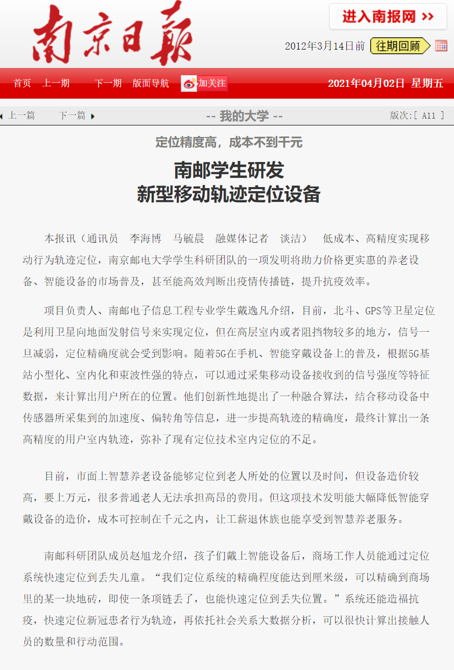 【南京日?qǐng)?bào)】南郵學(xué)生研發(fā)新型移動(dòng)軌跡定位設(shè)備