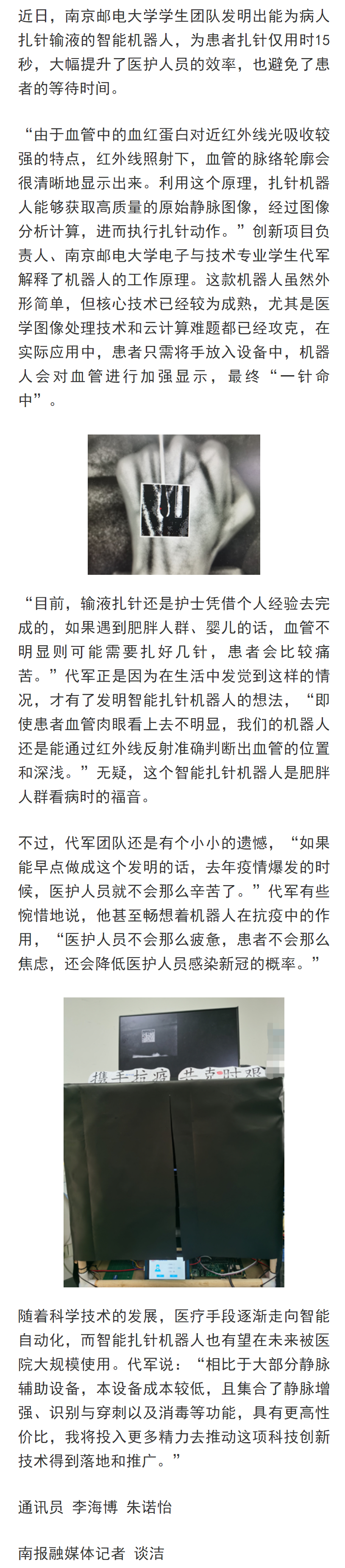 【南京日報客戶端】機器人給病人扎針輸液?南郵學子打造醫療新幫手